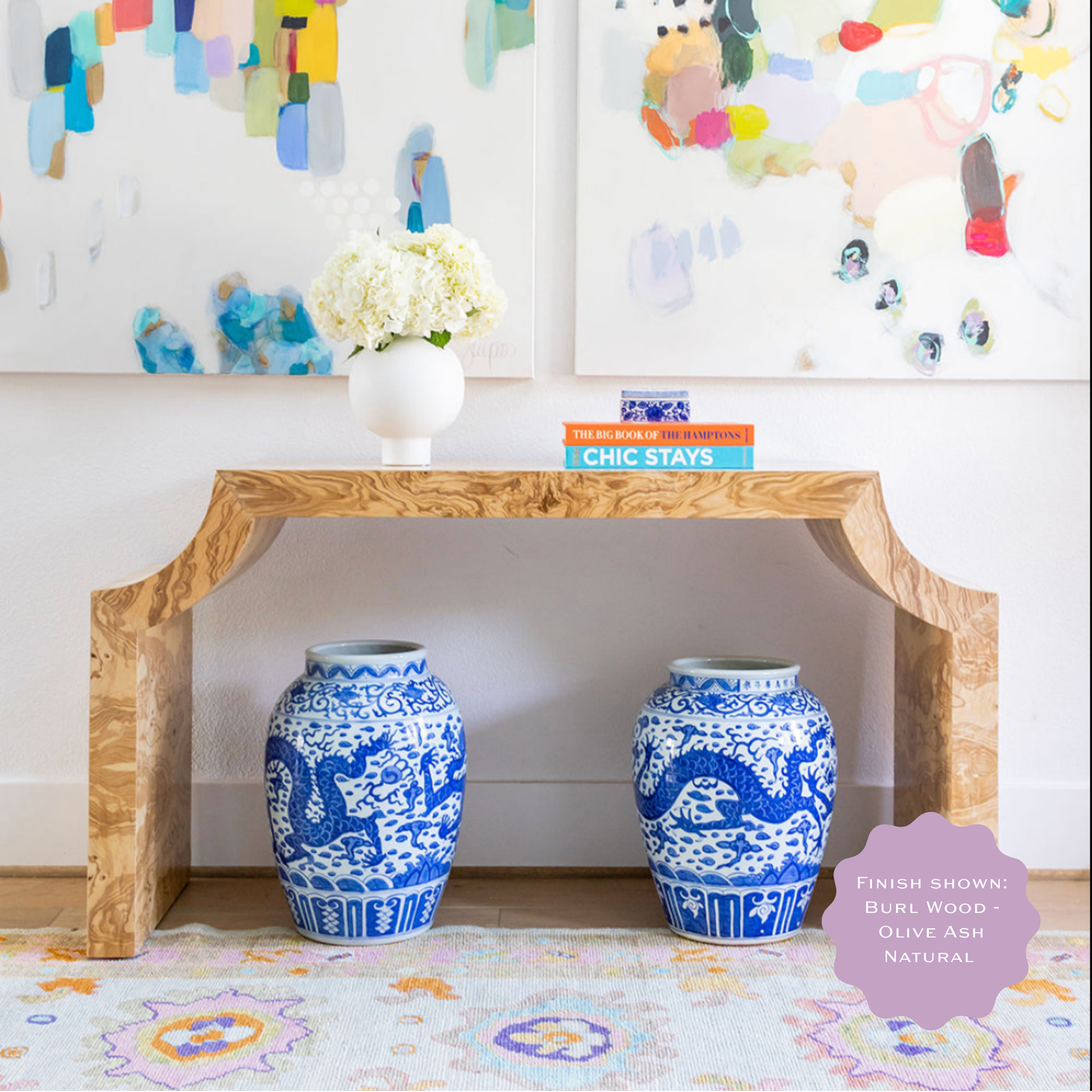 The Andi Console Table provides effortless curves creating a unique feel alongside a favorite sofa or grounding a piece of artwork. The Andi Console Table allows you to place an upholstered bench or a pair of woven baskets underneath for additional storage. This piece is a showstopper in any space. Available in both high gloss paint and burl wood.