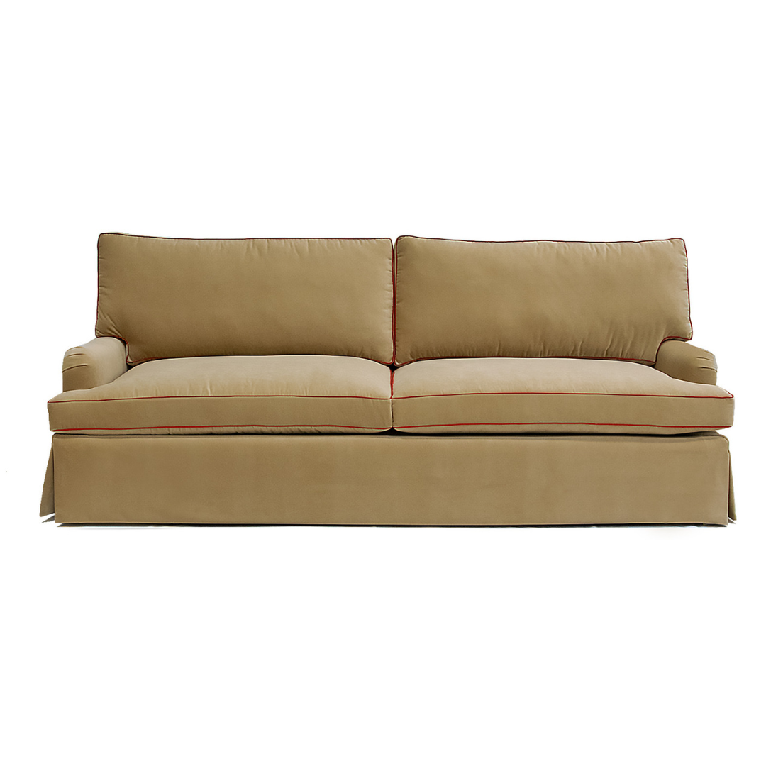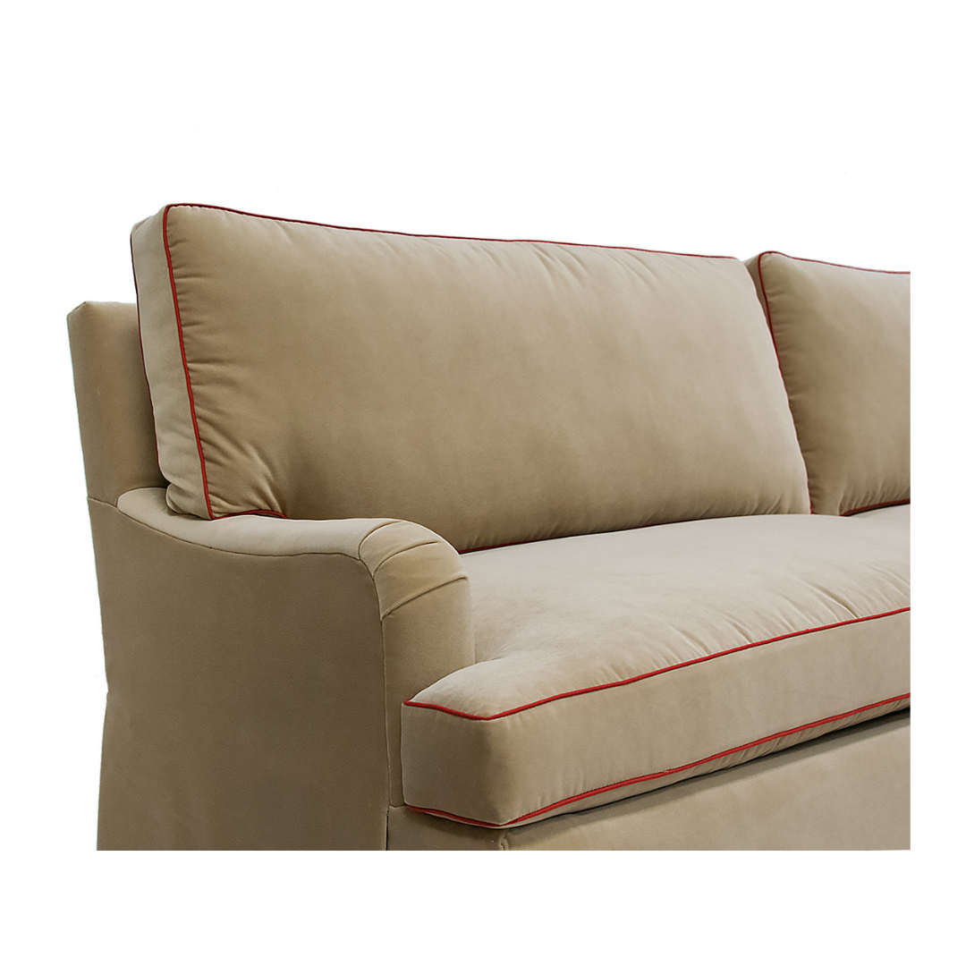 Fabrics shown: Velvet - Camel (self welt), Velvet - Camel and Piping - Red