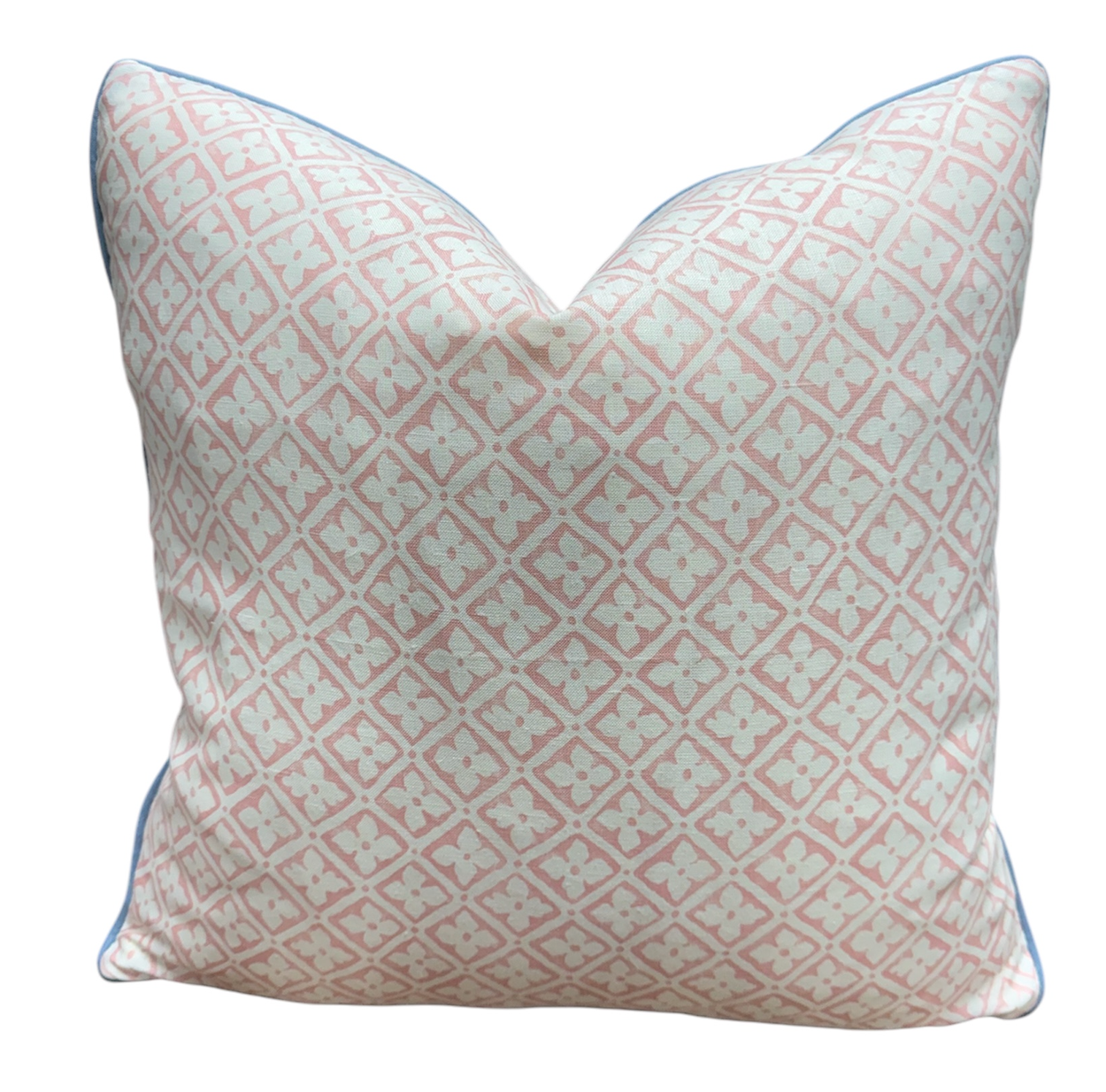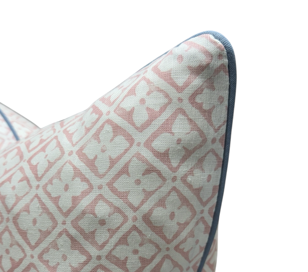 Custom made decorative pillow featuring Quadrille's Puccini in Soft Peach. Finished with a contrast Dusty Blue Piping.
