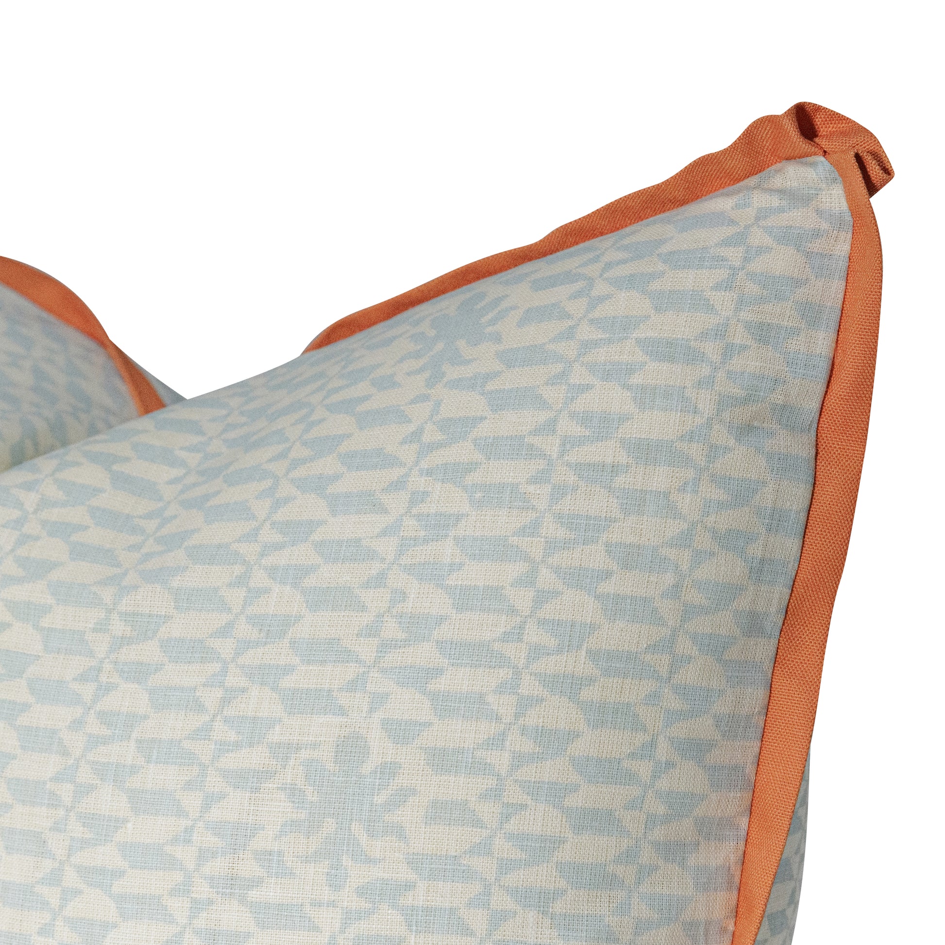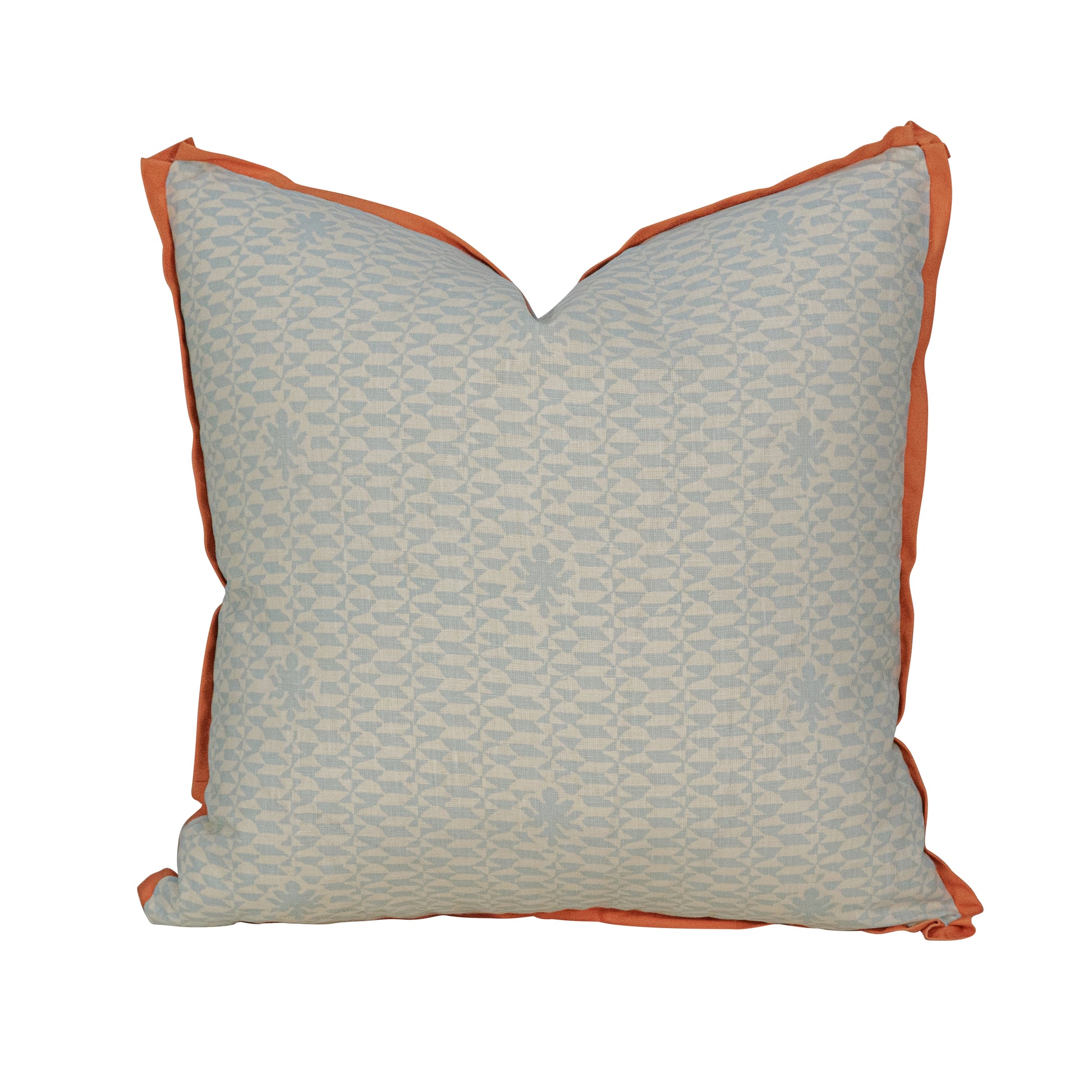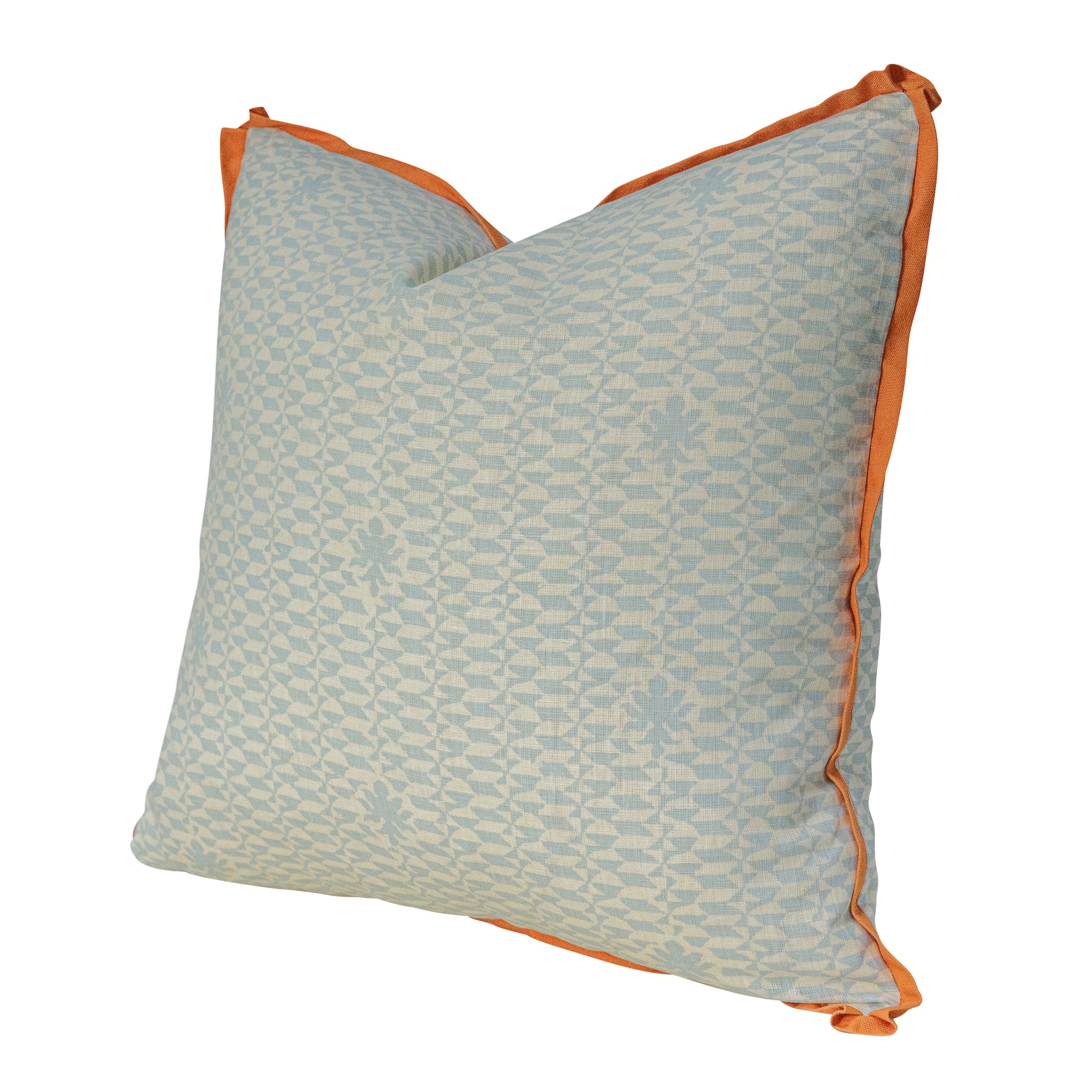 Custom made decorative pillow featuring Quadrille's Carlo II Teal fabric. Finished with a contrasting Orange pleated Flange. Pillow is double sided.