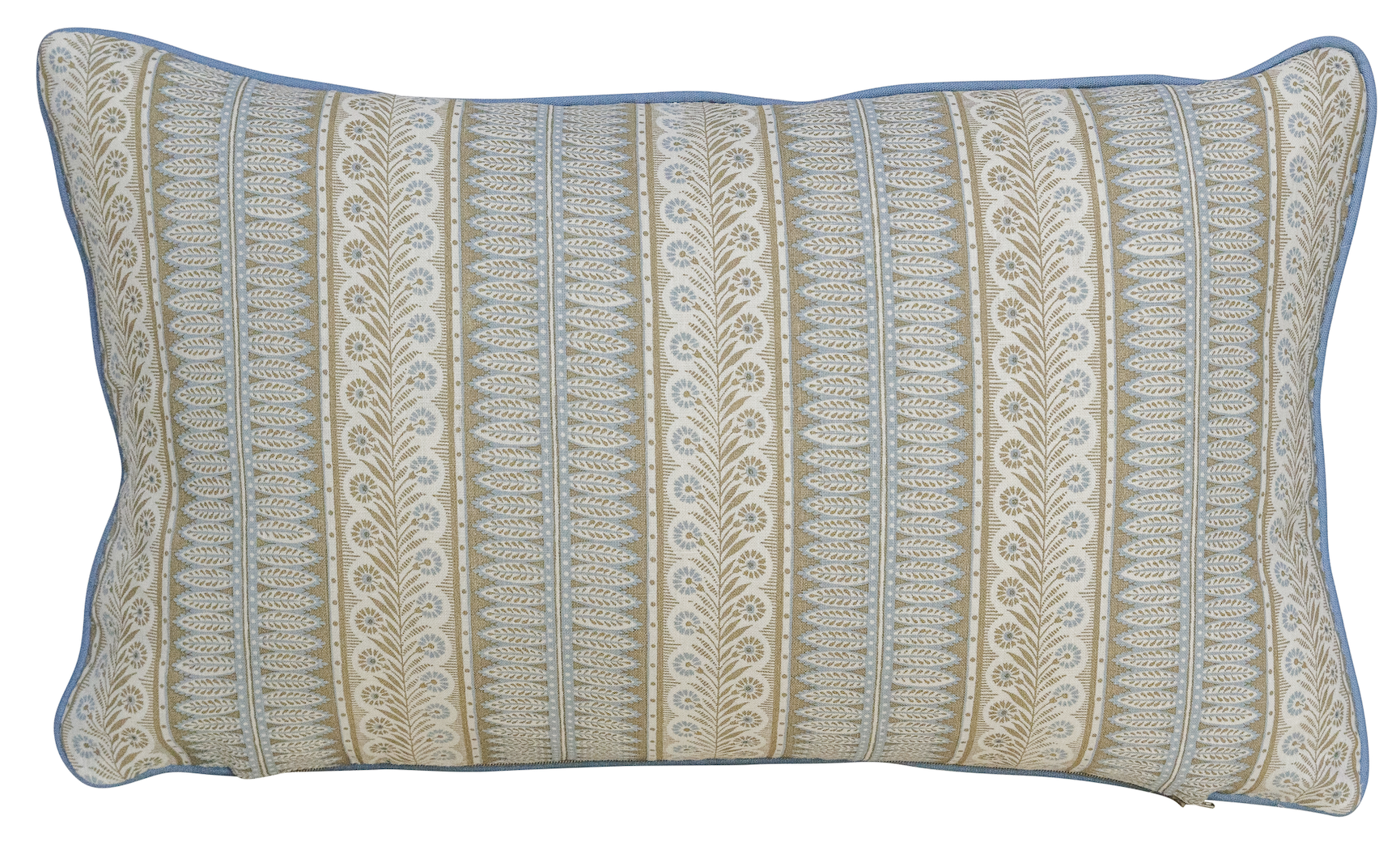 Custom-made pillow featuring Jasper Eastlake Sage and Slate fabric. Finished with a dusty blue piping.
