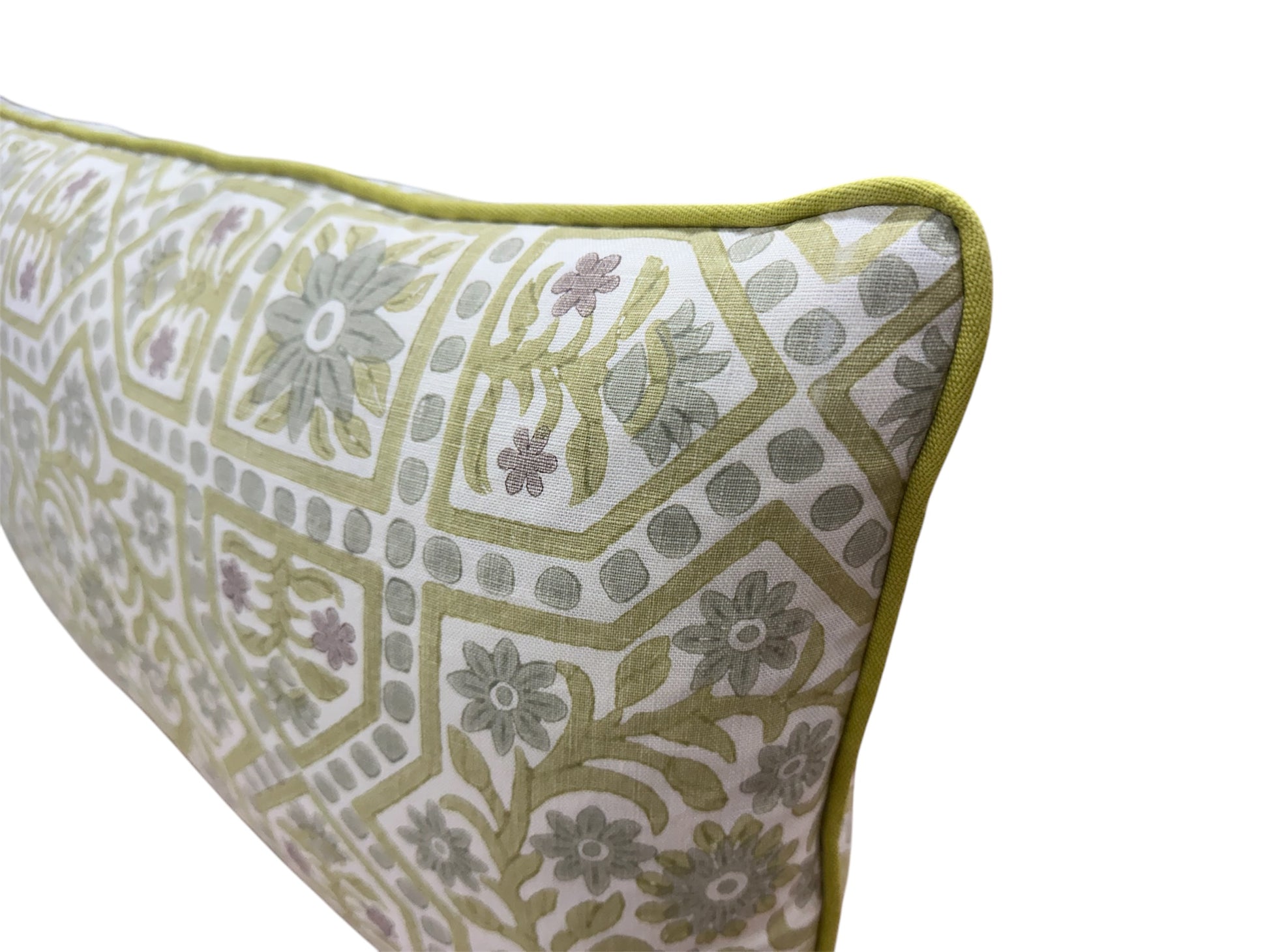 Custom made decorative pillow featuring Namay Samay Tulsi Bagan Light Olive fabric. Finished off with contrast chartreuse piping. Pillow is double sided.